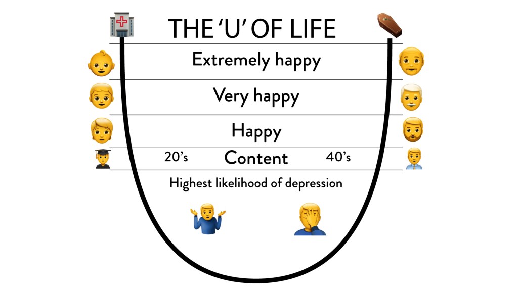 As you can see in the graph, the beginning of the U represents the first years of life where you are happy and satisfied. Responsibilities are limited to eating, playing, and sleeping. As the years pass more liabilities are acquired and free time becomes increasingly scarce. It is exactly at this stage that more significant challenges appear. In turn, as you learn to deal with pressure, gain more life experiences and achieve greater stability, the crest of happiness rises again.