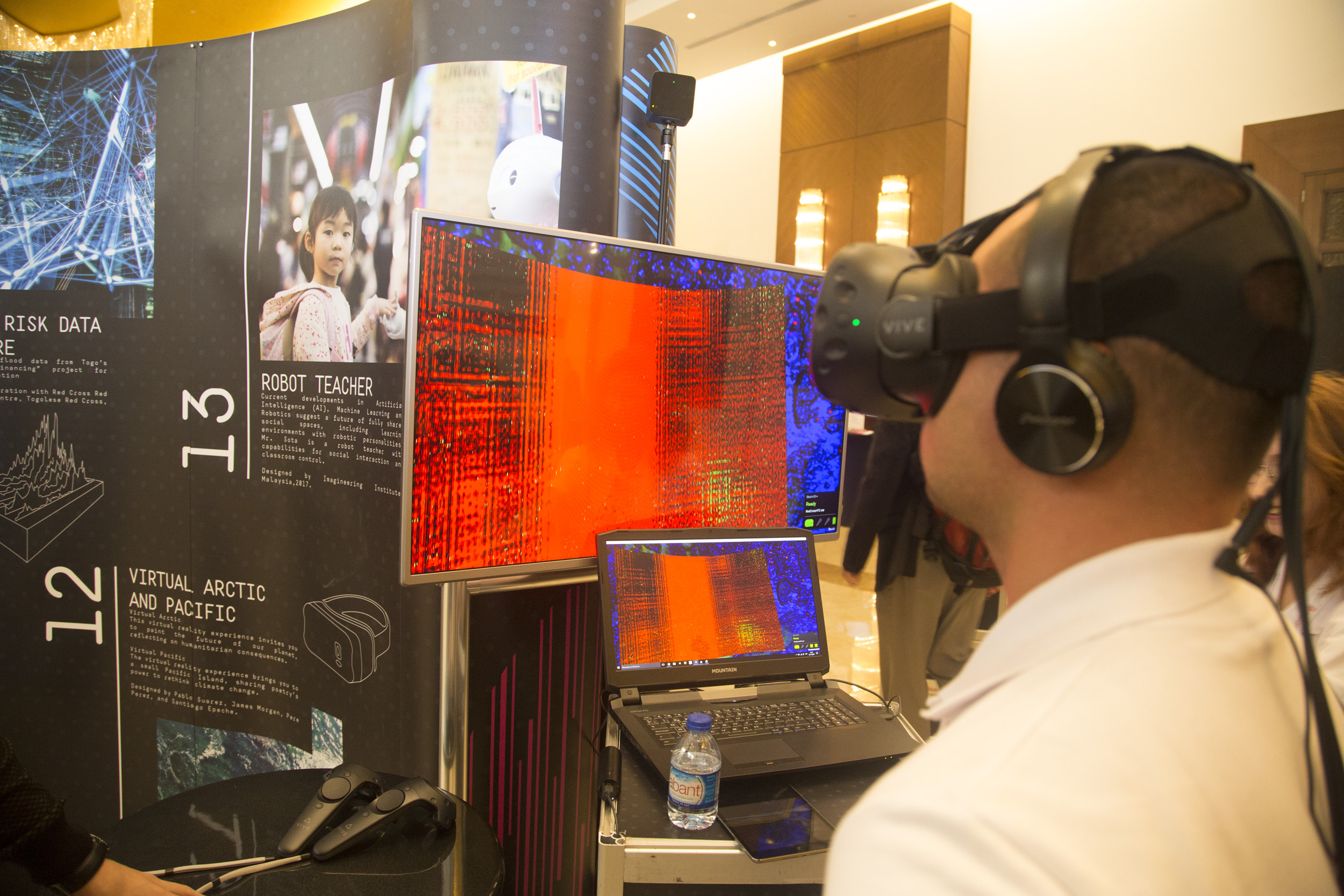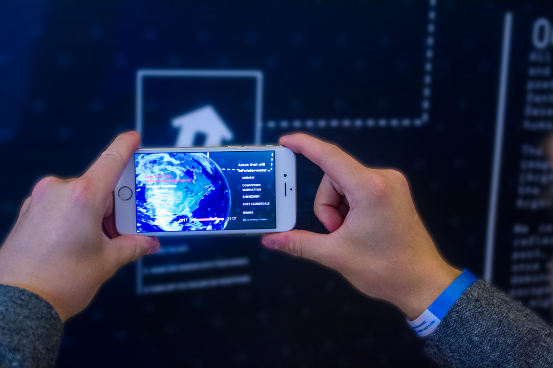 All the artefacts tell a story about a futures scenario that has implications for humanitarian need. The exhibition was broadly structured in three thematic areas. Firstly, climate and environment which explored the effects of climate change. This theme included artefacts such as bottled air from 2030, blended reality simulations, and satellite imagery art to portray potential realities as a consequence of the climate emergency consequences.