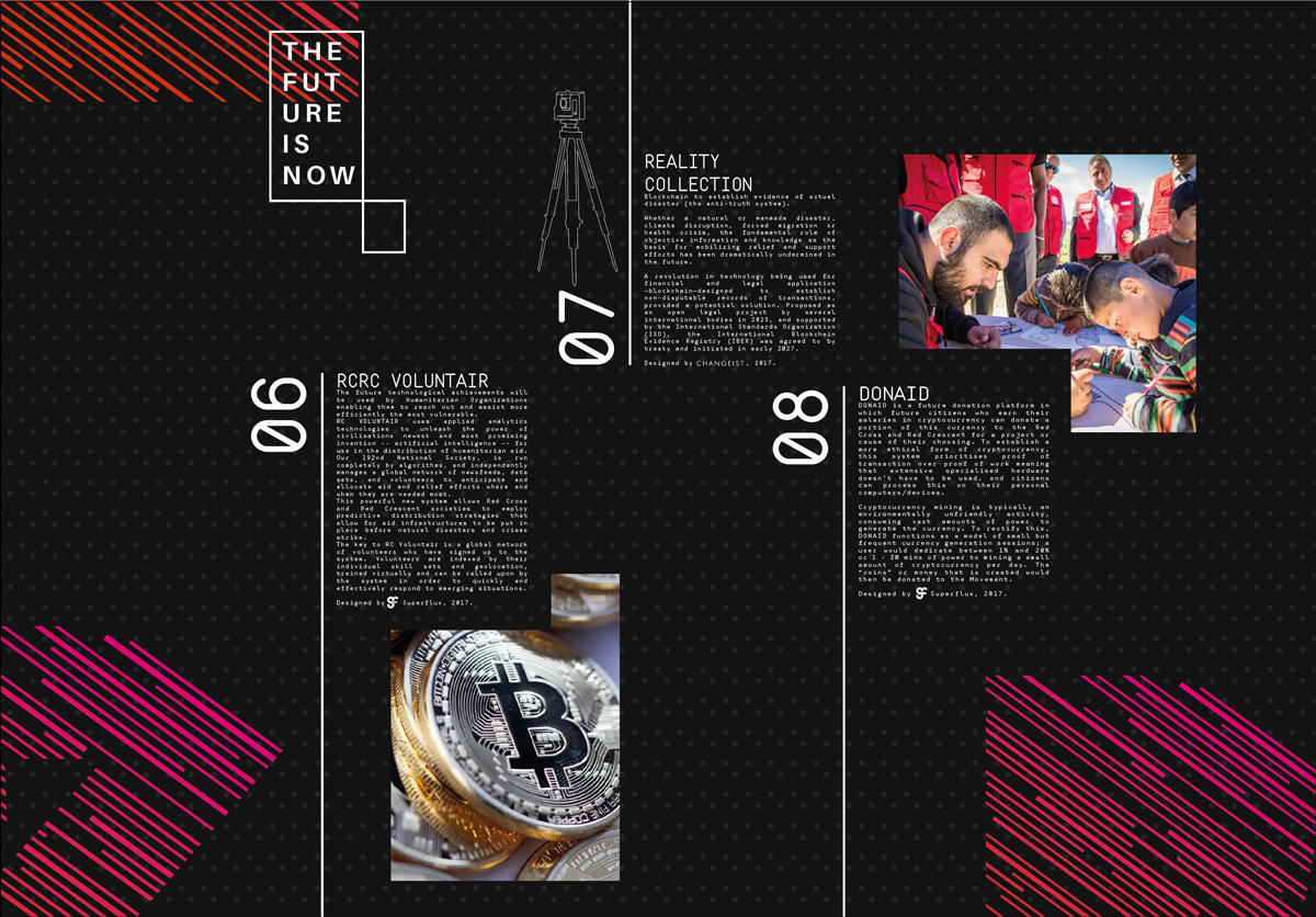 Secondly, technology for good that speculated how digital breakthroughs could impact the Red Cross Red Crescent network. Examples of this thematic area included artefacts like a genetic risk calculator, an AI-driven volunteering branch for the digital world, an e-currency donation system, a distributed evidence registry for tracking humanitarian crises, and humanitarian robotics.