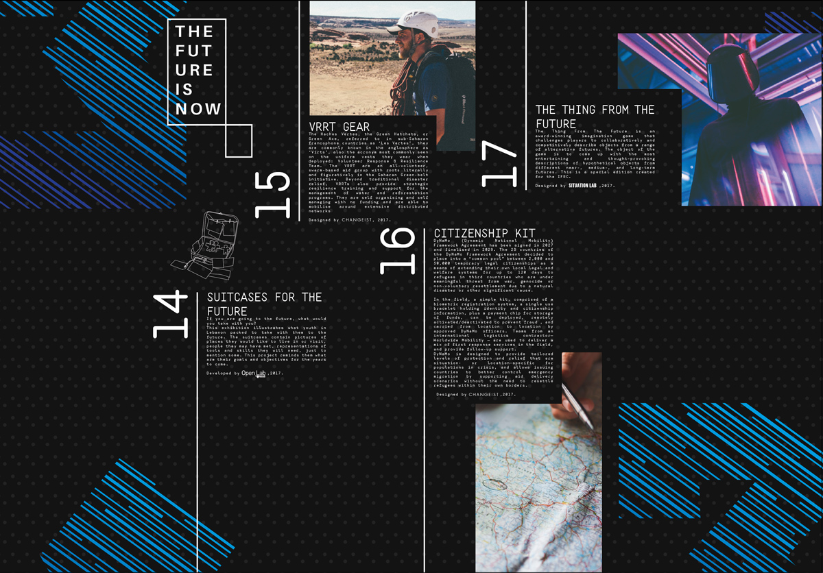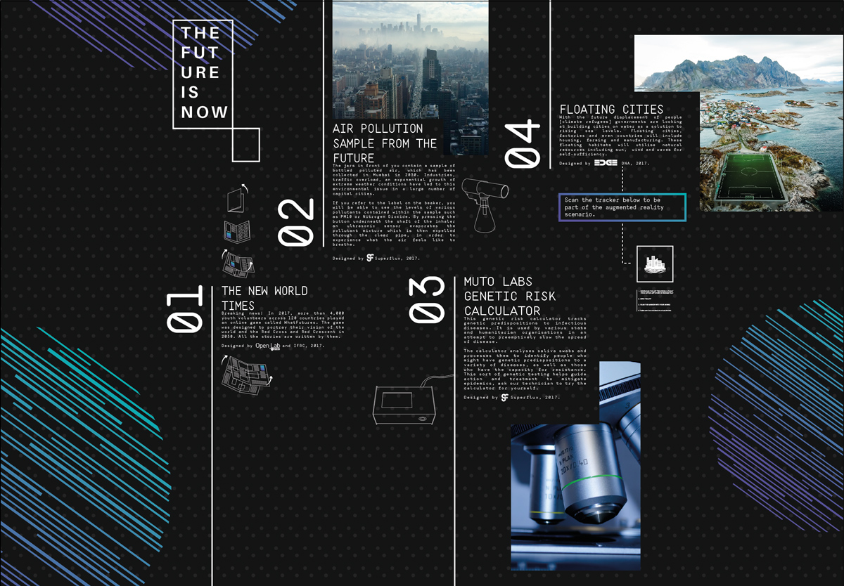 In collaboration with design agencies, such as Superflux, Changeist and Edge, the team curated ‘The Future Is Now’. The IFRC Solferino Academy and Open Lab at Newcastle University were the two primary teams constructing the narrative around the exhibition. This exhibition has been the first futures collection focused entirely on humanitarian needs (to the best of our knowledge), and accessible in four languages: English, Spanish, French, and Arabic. It was presented for the first time at the IFRC’s General Assembly in 2017 and then exhibited in multiple international venues, such as the Islamic Development Bank conference in Tunisia and the Humanitarian Networks and Partnerships Week in Switzerland.