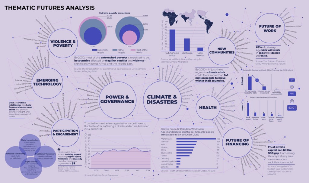 Thorugh this research phase, we found a combination of trends and emerging issues that bring both challenges and opportunities for humanitarian response. Among the multiple challenges identified through this phase, climate emergency was the most prominent one, profoundly impacting several aspects of humanitarian needs. When discussing climate emergency, many other challenges were entwined with this megatrend, such as food security, protracted conflict, displacement, loss of heritage, epidemics, to mention some. Therefore, to tackle this enormous challenge of the upcoming decade, humanitarian agencies will require unprecedented governance and coordination mechanisms.
